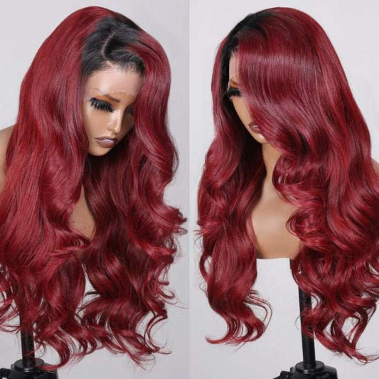 13x4 Lace Front Burgundy Red With Dark Roots Body Wave Wig