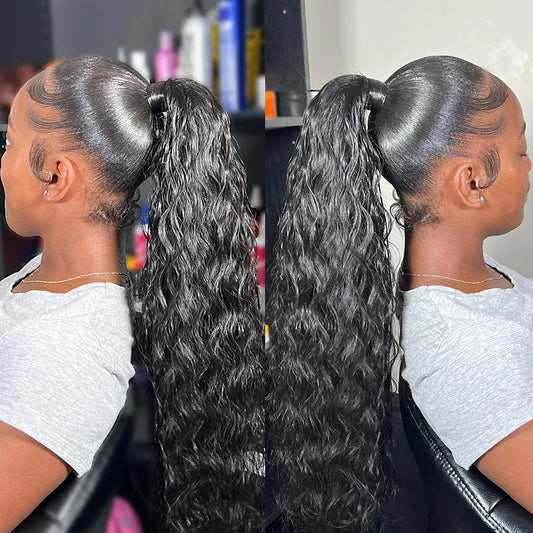 Water Wave Wrap-around Magic Velcro With Clip In Human Hair Ponytail Extension