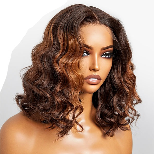 Elegant Brown Ombre Loose Wave 4x4 Lace Glueless Short Wig 100% Human Hair